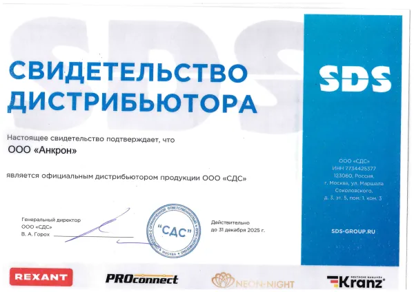 Наша продукция сертифицирована и соответствует действующим техническим регламентам. На сайте представлены официальные сертификаты соответствия, а также документы от производителей, подтверждающие, что «Анкрон» — официальный представитель более 70 брендов, включая IEK, EKF, Schneider Electric, Werkel, REXANT, JazzWay, Wolta, GreenEl и другие.