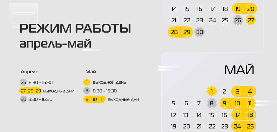 Cообщаем Вам об изменениях в графике работы нашей компании, связанных с праздничными днями в апреле и мае 2025 года.